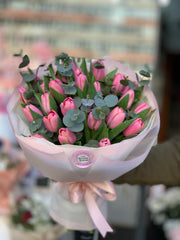 Buchet 25 Lalele Roz cu Eucalipt