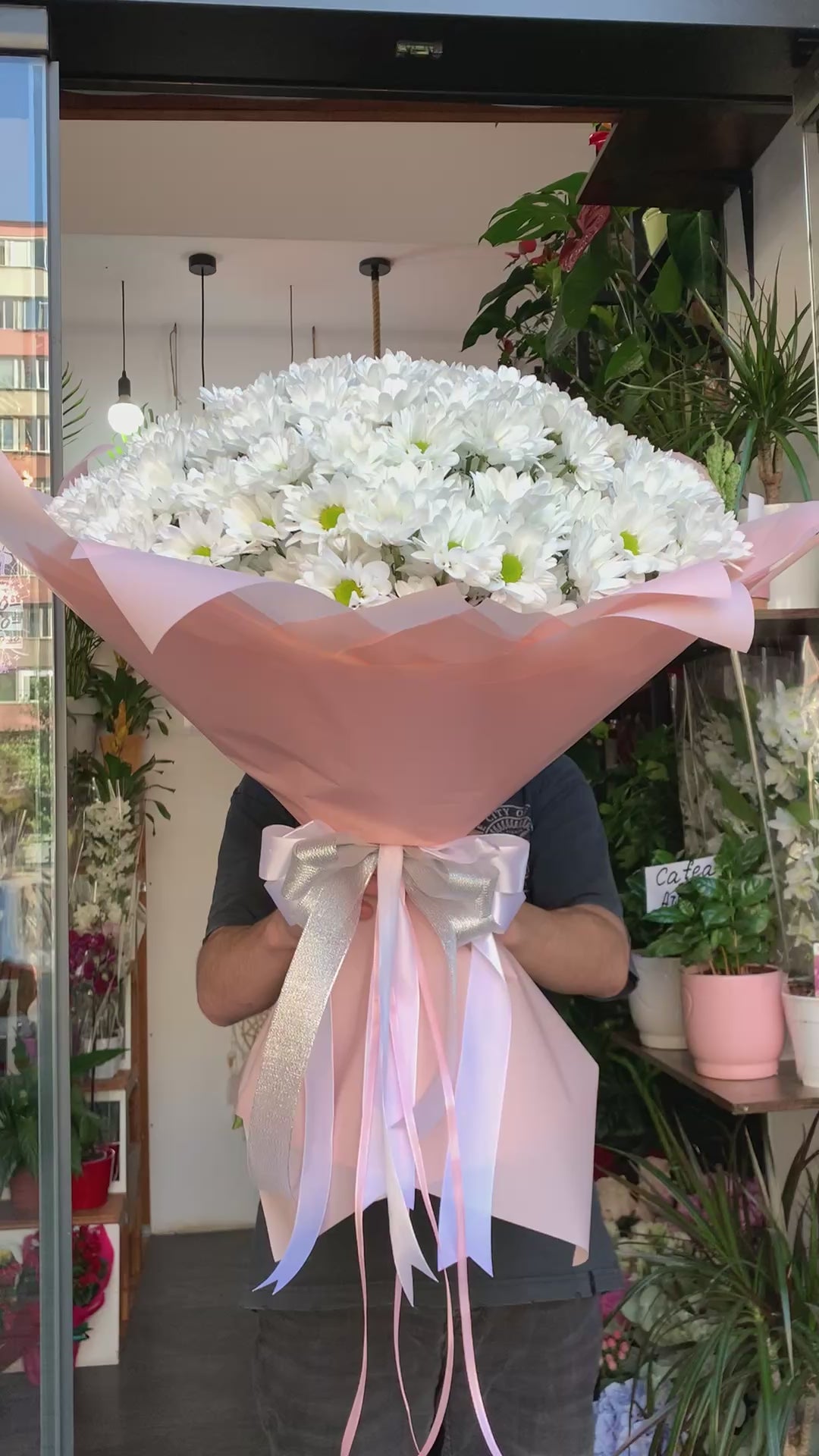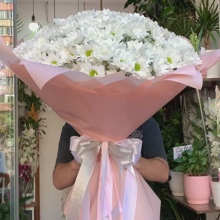 Il bouquet è composto da 51 crisantemi bianchi, con fiori ricchi e centro giallo-verde. I fiori sono disposti in modo compatto in una confezione rosa pallido, elegantemente legata con un nastro bianco e rosa. Questo bouquet colpisce per la sua freschezza, il volume e la semplicità, ed è una scelta raffinata per eventi speciali o per trasmettere pensieri sinceri.