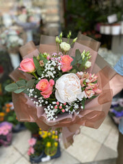 Bouquet di rose pesca, peonia bianca e gipsofila