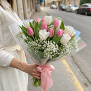 Un delicato bouquet primaverile con 6 tulipani rosa e 5 bianchi,completato da gipsofila vaporosa. Una scelta perfetta per un regalo o un'occasione speciale. Decorato con carta trasparente e legato con un nastro rosa.