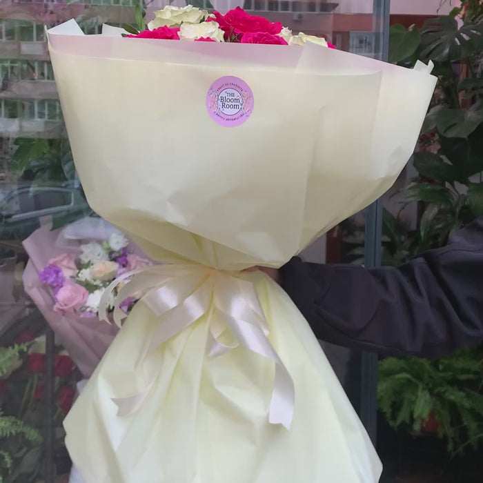 Compoziția elegantă: Trandafiri albi și roz ciclam premium • Ambalaj delicat în nuanțe crem