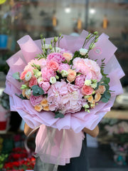 De ce să alegi acest buchet mixt premium? 🎨 Paletă pastel perfectă - roz, piersică, liliachiu și alb într-o armonie studiată 💎 Mix de flori premium - 5+ varietăți de flori selectate pentru eleganță maximă 📏 Volume spectacular - hortensiile mari creează impact vizual imediat 🌿 Texturi variate - de la catifelat (trandafiri) la vaporoasă (eustoma) 🎀 Ambalaj couture - multiple straturi roz liliachiu cu panglici argintii