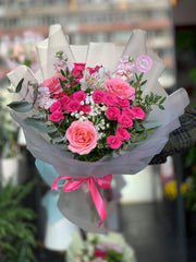 Una composizione vivace e piena di vita che combina armoniosamente diverse tonalità di rosa e pesca, creando un bouquet pieno di personalità e calore.
